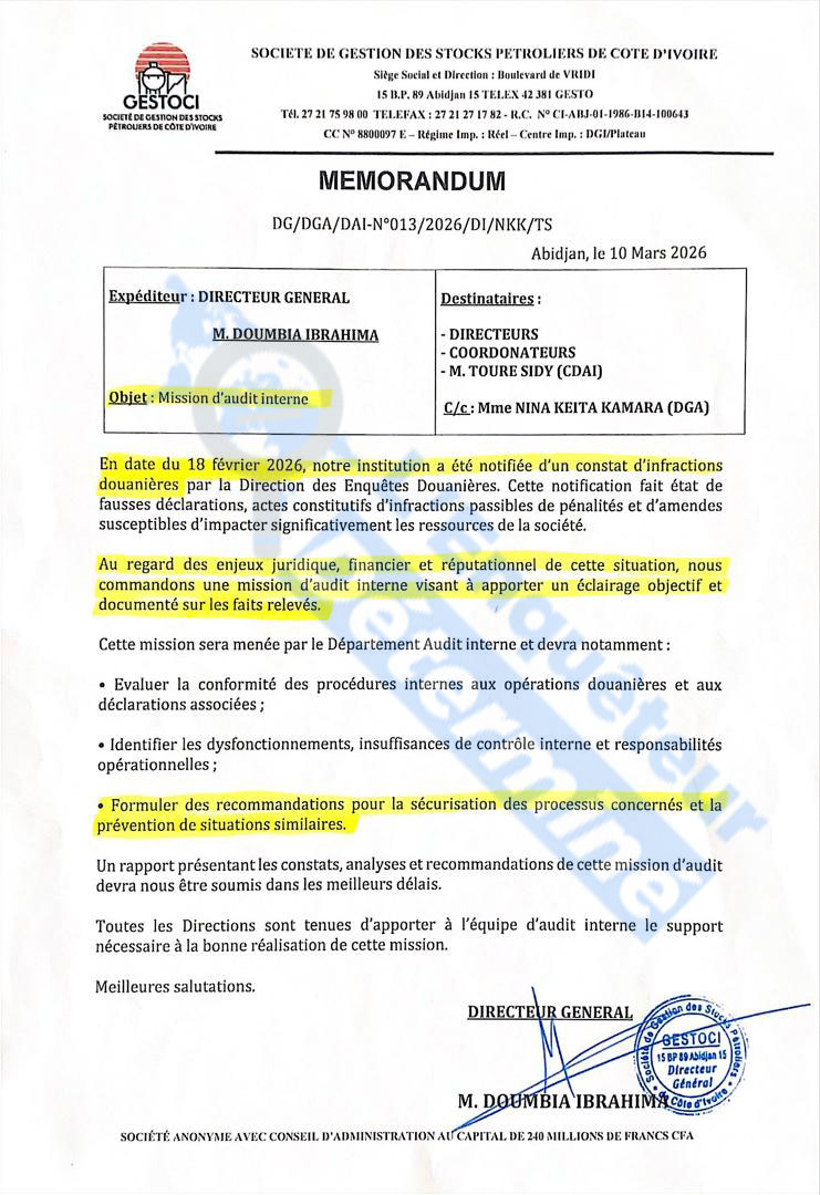 Dans le même temps, le directeur général de GESTOCI informe l’ensemble du personnel, par voie de courrier, du lancement d’une mission d’audit interne. Celle-ci est justifiée « au regard des enjeux juridiques, financiers et de réputation » auxquels l’entreprise est exposée, selon un document également consulté.