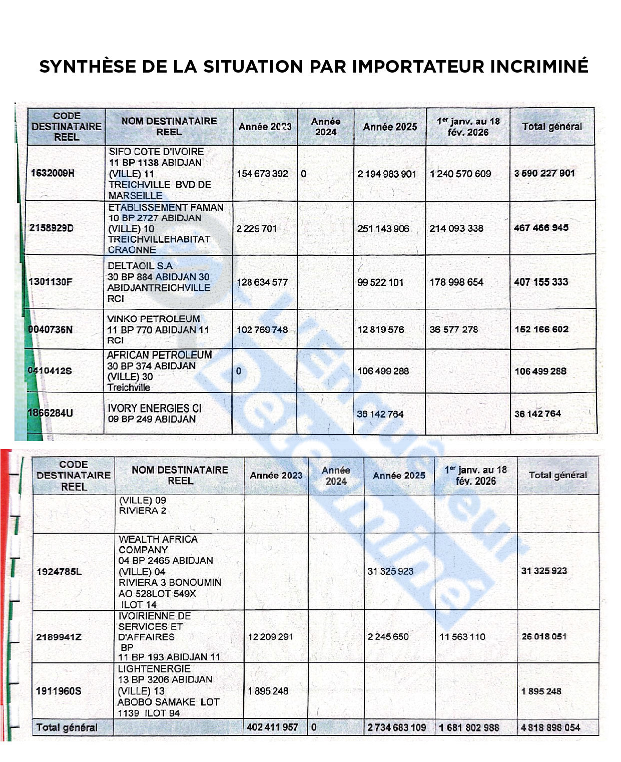 Les documents recoupés par l’Enquêteur Déterminé illustrent un schéma récurrent : des volumes de carburant déclarés largement inférieurs aux quantités réellement enlevées dans les dépôts. Dans certains cas, les opérateurs ne seraient acquittés que de moins de 10 % des droits dus, selon les éléments comparatifs entre données douanières et registres de GESTOCI (Société de gestion des stocks pétroliers de Côte d’Ivoire).