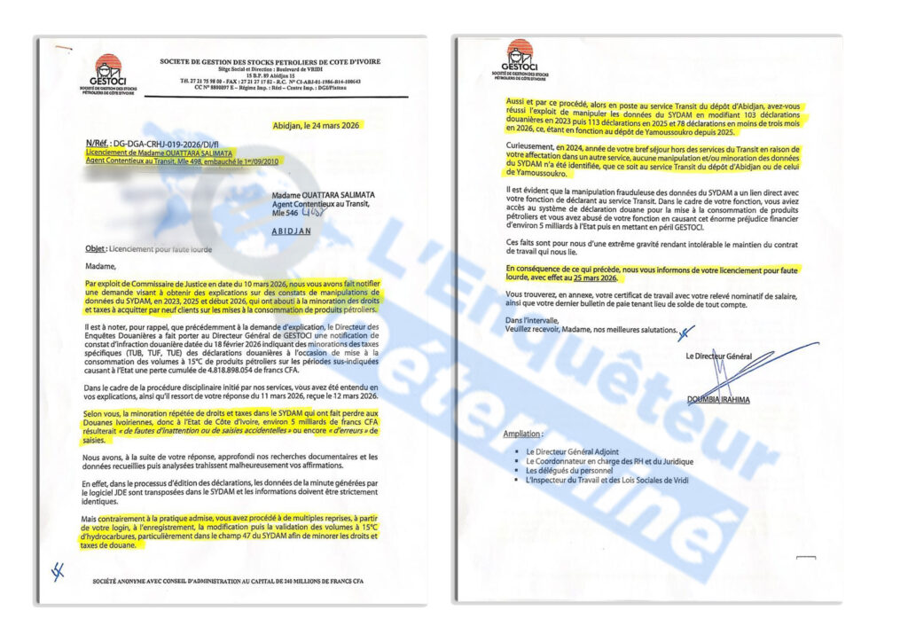 Tout bascule avec un courrier daté du 18 février 2026, adressé à GESTOCI. Dans cette correspondance, le directeur des enquêtes douanières écrit : « Au regard des faits, votre société est susceptible d’avoir commis une infraction douanière qualifiée de délit de première classe pour fausse déclaration, manœuvre ayant permis de mettre à la consommation des produits pétroliers, marchandises fortement taxées, en éludant le paiement de droits et taxes ».  En tant que déclarant en douane pour les entreprises qu’elle approvisionne, GESTOCI se retrouve directement exposée.